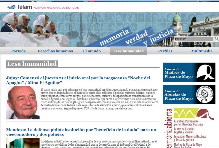 La página «Memoria, Verdad y Justicia» editada y publicada en la web desde marzo de 2012 por la agencia nacional de noticias Télam, es una contribución, desde un medio público, a la consolidación de la democracia y los derechos humanos, arduas conquistas de todo el pueblo argentino.