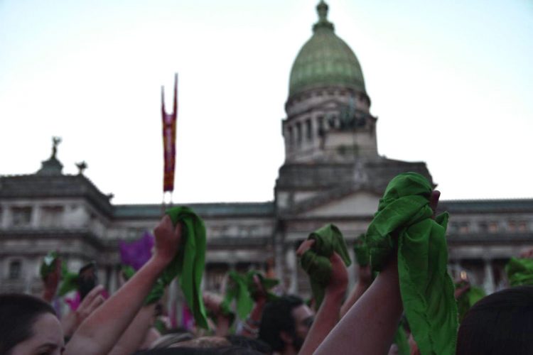 Una hora más tarde comenzaron las indicaciones para el pañuelazo multitudinario y conjunto, coordinado por una artista: primero atarse el retazo verde en la muñeca izquierda. Luego, la ceremonia: “lesbianas, travestis, trans, juezas, policías y muchas otras disidencias, abortamos”. Los gritos, en un principio tímidos, terminaron volviéndose ensordecedores frente al Congreso.