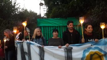Patricia Walsh encabezó la nutrida columna de organizaciones sociales, de derechos humanos y gremiales que al caer la tarde, con poca luz natural, hizo ver las antorchas que adornaron el acto y los discursos en la puerta de reja, tapiada por una oportuna lona verde que, dicen los que saben, no se deja ver durante el resto del año.