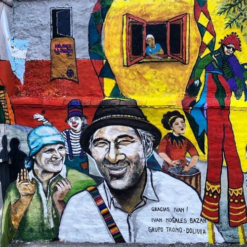 Foto principal: Mural realizado en Mendoza, este domingo, por los grupos de teatro “Chacras Para Todos” y “TRONO”, en homenaje al reconocido actor, director de teatro y gestor cultural boliviano Iván Nogales, impulsor de la caravana CVC, fallecido recientemente.
