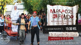 Barracas al fondo es un espectáculo teatral callejero en el que participan 90 vecinos y vecinas. Cuando hablamos de teatro callejero es un teatro que se realiza en las calles de nuestro barrio, es un recorrido por la zona donde está ocurriendo la marginación y en donde no sólo está la dramaturgia del texto y de la actuación, de las canciones y de la música, sino que está lo que cuenta el espacio. Esos viejos puentes del ferrocarril, ese tren que pasa por arriba de los espectadores, esas calles empedradas, con baches, semi abandonadas de la zona sur de la Ciudad de Buenos Aires.
