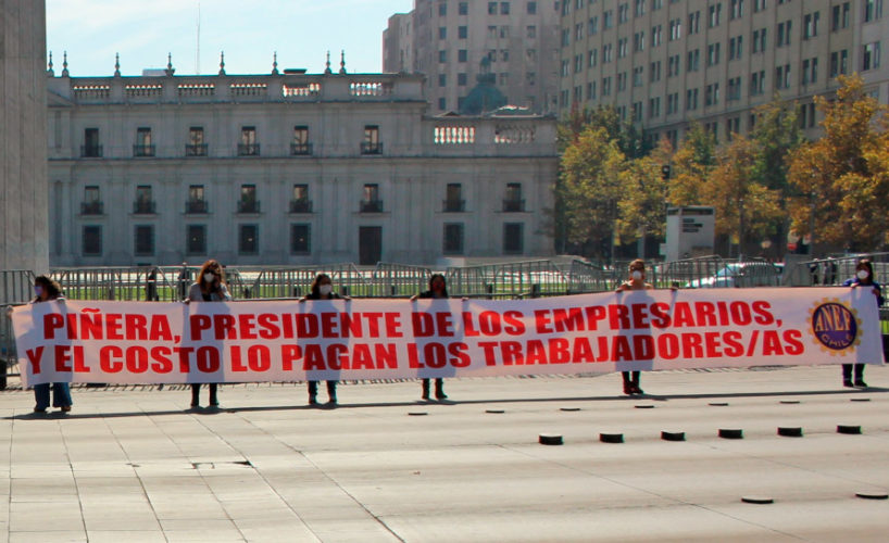 Redacción Canal Abierto | El fin de semana el gobierno de Chile publico el Oficio Presidencial N°18, que exigía el retorno de funcionarias y funcionarios del Estado a cumplir sus roles de manera presencial. La Asociación Nacional de Empleados Fiscales interpuso un Recurso de Protección y realizó una acción pacífica frente al Palacio de la Moneda, respetando los protocolos de protección sanitaria y distanciamiento social. Sin embargo, personal de carabineros detuvo a las y los dirigentes que participaron de la manifestación que consistió en desplegar dos banderas que decían “Piñera presidente de los empresarios, y el costo lo pagan los trabajadores/as”, y “La crisis sanitaria y social no la pagan los trabajadores/as. Si a la vida”.