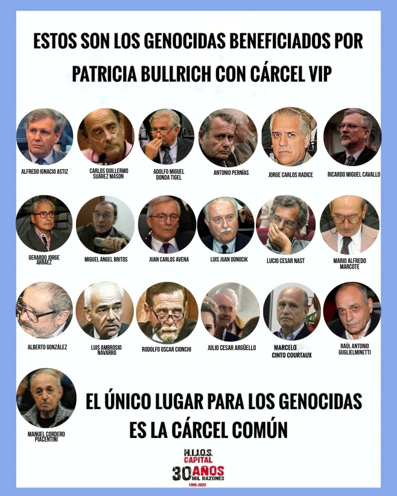 Por Elisa Corzo | Meses después de la reunión de diputados y diputadas de La Libertad Avanza con condenados por delitos de lesa humanidad presos en la cárcel de Ezeiza, 10 de esos genocidas y otros 9 que no participaron del encuentro pasan a cumplir su condena en “la cárcel VIP de Campo de Mayo”, informó la agrupación H.I.J.O.S Capital.