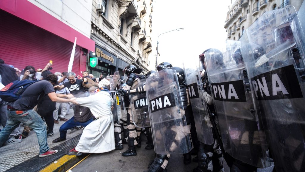 Una vez allí, mientras manifestantes y curas rezaban el Padre Nuestro, comenzaron los gases y los palos. No hubo rosario ni crucifijo que amedrentara a las fuerzas represivas.
