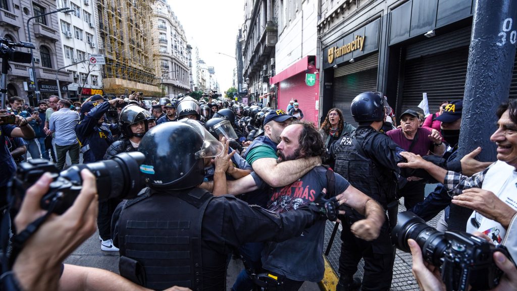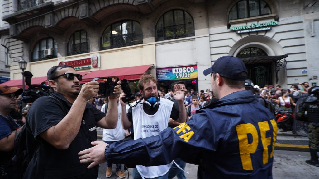 Fue entonces cuando el operativo desplegado por la Policía Federal, Gendarmería y Prefectura empezó con su rutina de cada miércoles. Bajo la excusa de cumplir con el protocolo antiprotesta se obligó a subir a la acera a los manifestantes que estaban sobre Rivadavia.