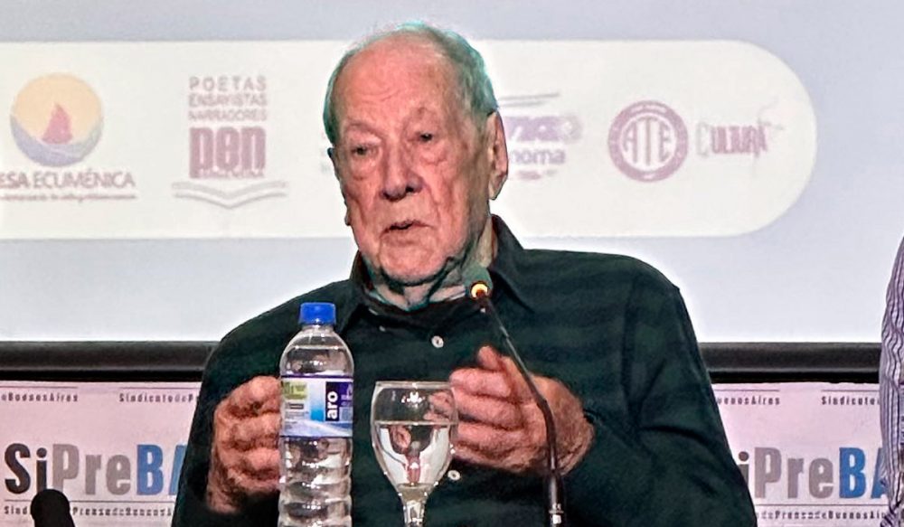 El hombre, de 91 años, comenzó hablando de la realidad política en Argentina y Estados Unidos, su país de residencia. “El problema que tenemos es el fascismo de payasos, en Estados Unidos y acá. Estamos viviendo en un momento muy peligroso”, dijo.