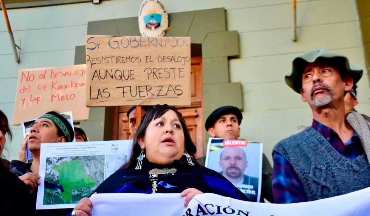 “Repudiamos la orden de desalojo que nos dio cinco días hábiles para retirarnos de nuestro territorio”, sostuvo Amancay Quintriqueo, logko del Lof Kinxikew, en conferencia de prensa frente a la Casa de Gobierno de Neuquén, acompañada por el logko Lucas Melo, del lof homónimo. “Nosotros hemos tomado la decisión de resistir en nuestros territorios, siempre lo hemos hecho, nunca hemos dejado la posesión de esos territorios. Toda responsabilidad de lo que llegara a suceder el lunes va a ser del estado provincial y nacional; de lo que le pueda llegar a suceder a nuestras infancias, a nuestros adultos mayores y a todos los integrantes de nuestras comunidades”.
