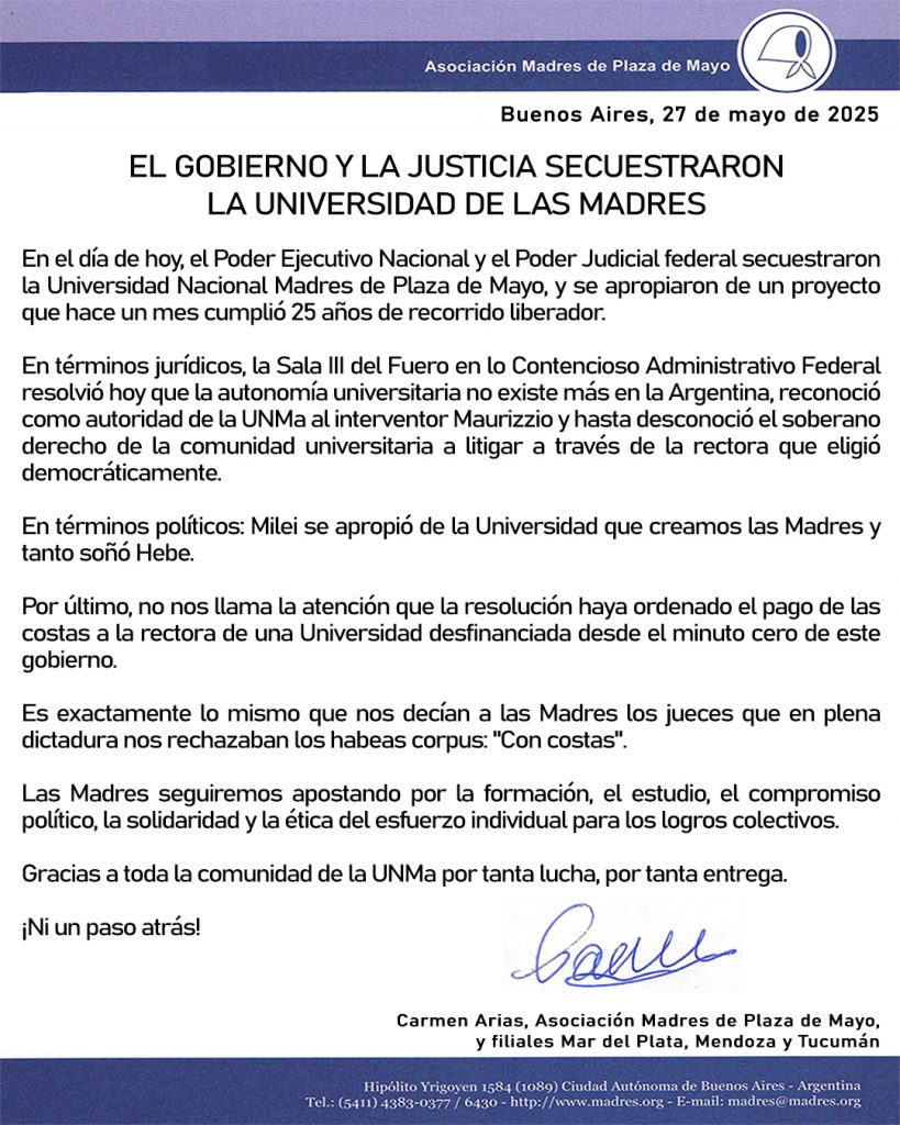 Mediante un comunicado, la Asociación denunció que “el Poder Ejecutivo Nacional y el Poder Judicial federal secuestraron la Universidad Nacional Madres de Plaza de Mayo y se apropiaron de un proyecto que hace un mes cumplió 25 años de recorrido liberador”. Además advirtieron que se violó la autonomía universitaria al desconocer “el derecho de la comunidad universitaria a litigar a través de la rectora que eligió democráticamente”.