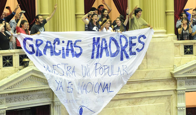 “No sólo no los buscaban –siguió comparando-, no sólo encubrían los crímenes y las desapariciones, además les imponían el pago de un dinero que las Madres no tenían. La misma burla, la misma crueldad, para secuestrarles a las Madres de Plaza de Mayo su Universidad. La que crearon hace 25 años y soñó Hebe. La que desfinanciaron desde hace 17 meses”.