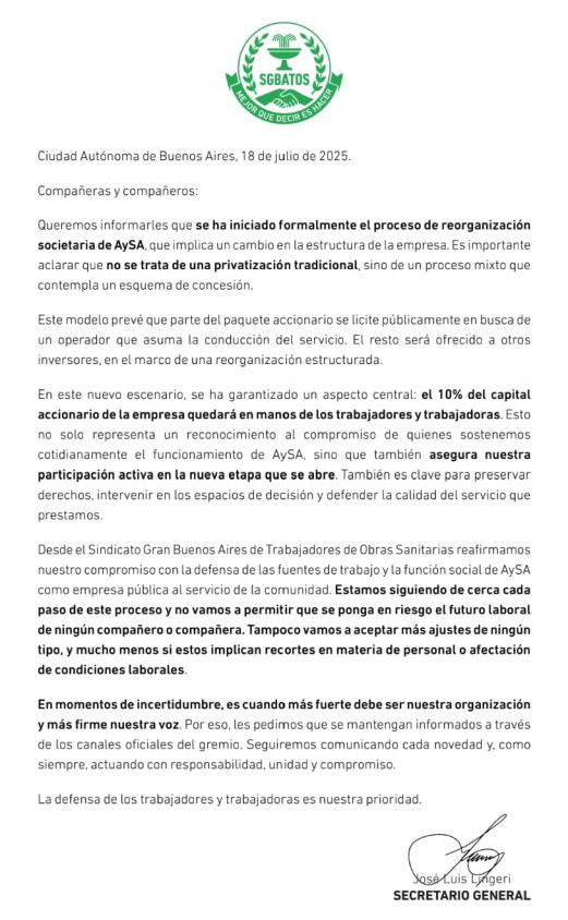 “En este nuevo escenario se ha garantizado un aspecto central: el 10% del capital accionario de la empresa quedará en manos de los trabajadores y las trabajadoras. Esto no sólo representa un reconocimiento al compromiso de quienes sostenemos cotidianamente el funcionamiento de AySA, sino que también asegura nuestra participación activa en la nueva etapa que se abre”, reza un comunicado del gremio en el que informa las “buenas nuevas” de la reprivatización, con la firma de su secretario general, que en octubre cumplirá 41 años al frente del SGBATOS.