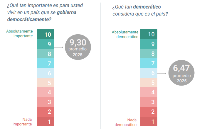 Así, la pregunta “¿Qué tan importante es para usted vivir en un país que se gobierna democráticamente?” obtuvo 9,30, lo que se traduce en una consideración importante del sistema. Sin embargo, la pregunta “¿Qué tan democrático considera que es el país?” apenas llegó al 6,47. ¿Se valora lo que no se considera que no se tiene?