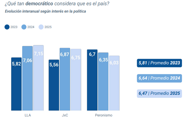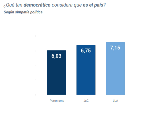 Donde más variación se ve respecto de esta pregunta es de acuerdo con la identificación política de los encuestados. Así, quienes se reconocieron como adherentes a La Libertad Avanza calificaron 7,15 a la segunda pregunta, los del PRO 6,75 y los peronistas, 6,05. Sin embargo, en 2023, cuando las escuderías estaban invertidas en relación  al oficialismo y oposición, las valoraciones eran inversas: los votantes del Frente de Todos calificaban con 6,7, los del PRO, 5,56 y los libertarianos 5,82.