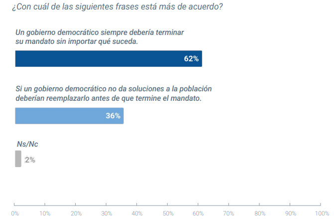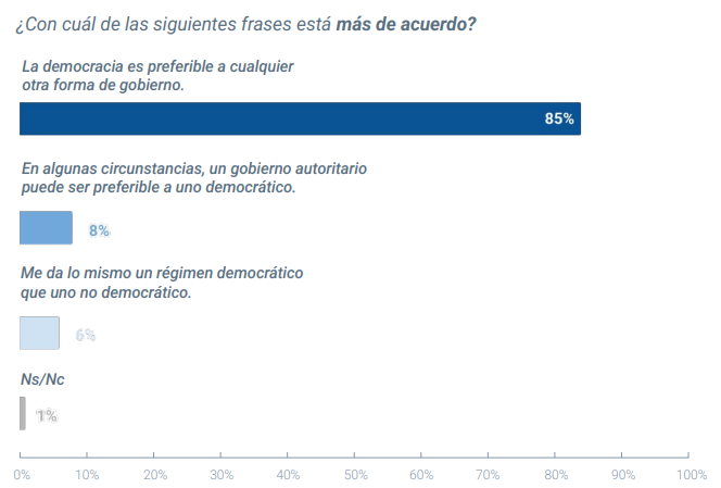 En otro ítem se presentaron tres frases entre las que había que elegir aquella con la que se está más de acuerdo. El 85% se identificó con “La democracia es preferible a cualquier otra forma de gobierno”, el 8% con “En algunas circunstancias, un gobierno autoritario puede ser preferible a uno democrático” y el 6% con “Me da lo mismo un régimen democrático que uno no democrático”.