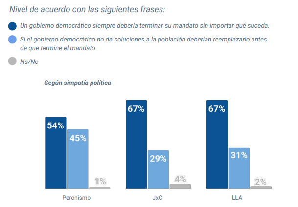 Haciendo foco en cuánto se esta de acuerdo con cada frase, el estudio concluye que “la paciencia con el presidente de turno depende del color político del gobierno”, ya que entre los peronistas el acuerdo con la primera es del 54% y con la segunda del45%, enter los ex amarillos del 67% y el 29, respectivamente y ente los libertarianos, 67% y 315.
