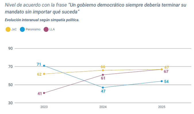 El siguiente eje consultado tiene que ver con las reglas de la democracia. Un 62% acuerda con la frase que postula que “Un gobierno democrático siempre debería terminar su mandato sin importar qué suceda”, contra un 35% que lo hace con “Si un gobierno democrático no da soluciones a la población deberían reemplazarlo antes de que termine el mandato”. En 2023, las adhesiones eran del 61% y el 57%, respectivamente y en 2024, del 37% y el 42%.