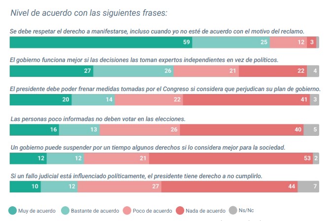 “Las preguntas exploran cómo se valoran los límites al poder presidencial, el rol del Congreso, la justicia, el derecho a la protesta y la vigencia de las libertades individuales”, se explica en la introducción a este módulo y plantea que “se trata de una dimensión fundamental para comprender no solo el apego a la democracia en abstracto, sino también las condiciones concretas que la sociedad permite para su funcionamiento”.