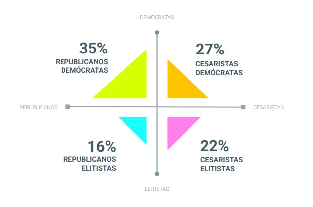 - Republicanos elitistas: son el 16% y defiende los contrapesos republicanos y las restricciones al poder presidencial, aunque presentan una visión limitada de la democracia en términos de inclusión. 8 de cada 10 creen que las personas poco informadas no deberían votar. El 66% piensa que si un gobierno democrático no da soluciones, debería ser reemplazado antes de tiempo. El 95% rechaza suspender derechos en situaciones excepcionales, el 96% rechaza que el presidente pueda obviar un fallo judicial y el 79% rechaza que el Poder Ejecutivo frene medidas del Congreso.