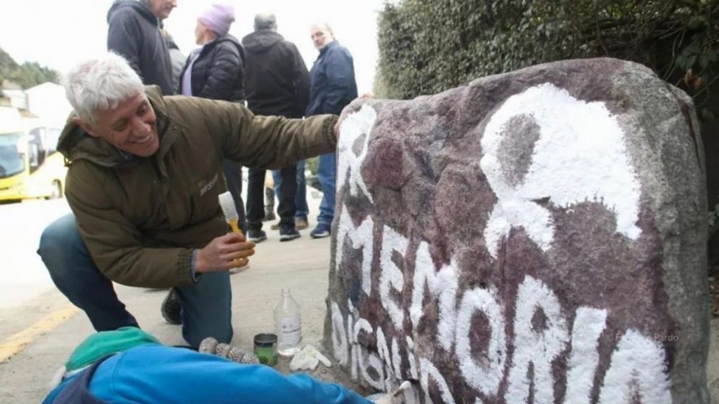 Un testigo mudo del encuentro entre Chaves y Astiz fue la piedra que parecía estar ahí para marcar un hito. Se la llama la Piedra de la Memoria y de la Dignidad. Desde aquella piña, cada año se vuelve a pintar un pañuelo blanco y a escribir MEMORIA en su cara más plana. Pero hace unos meses, viendo que se cumplirían tres décadas, artistas plásticos propusieron intervenir.