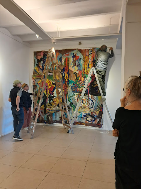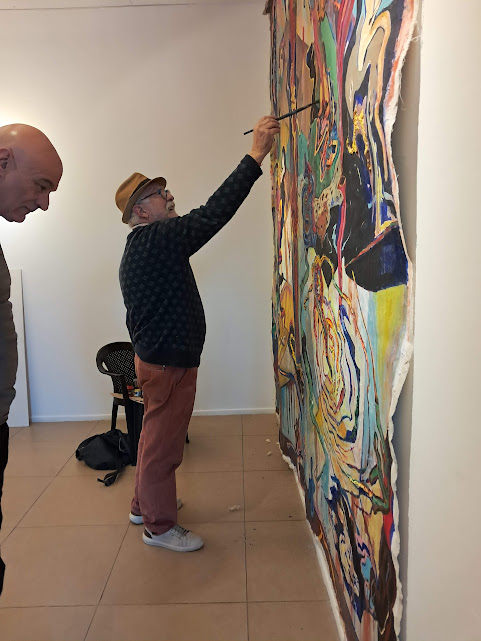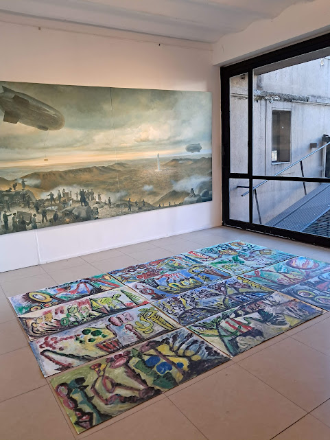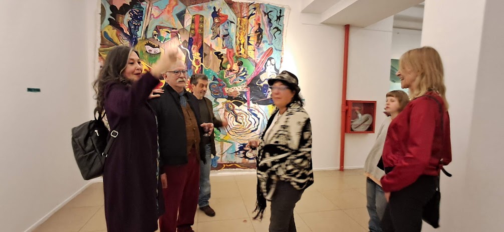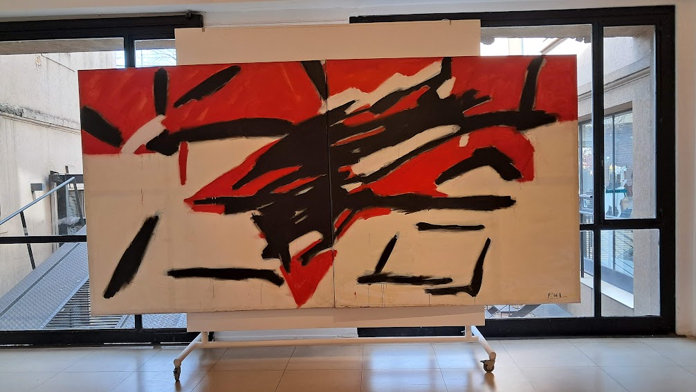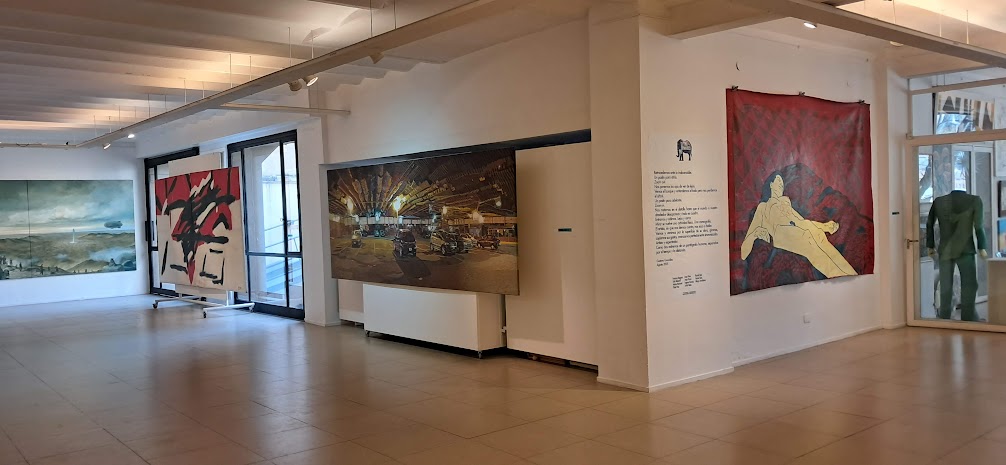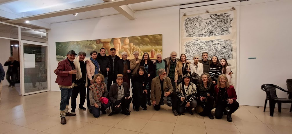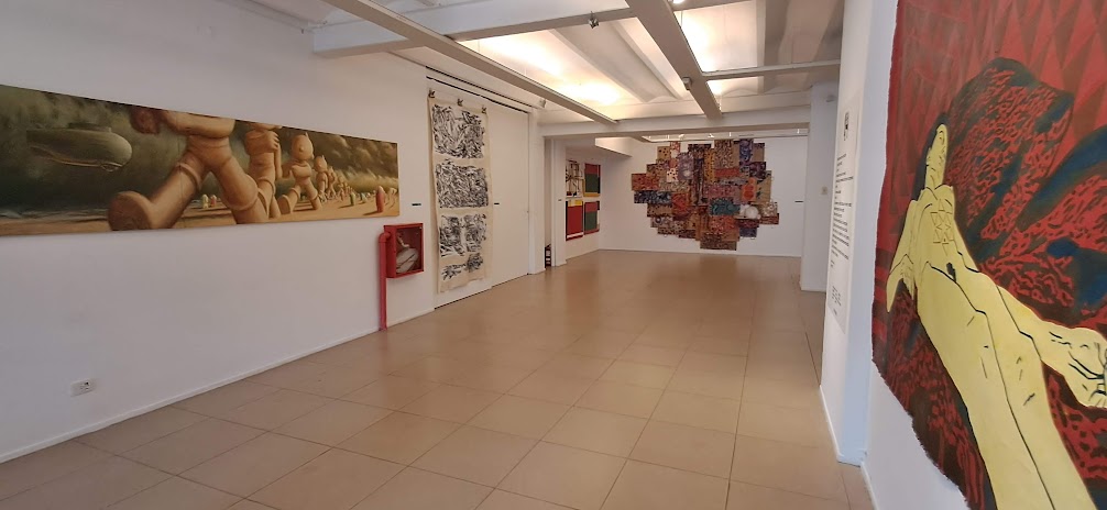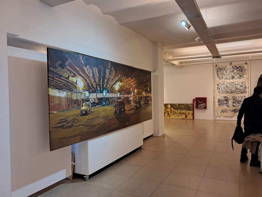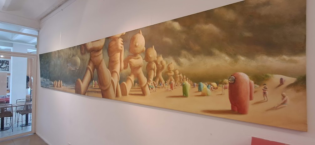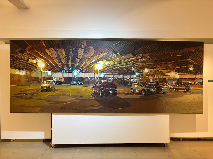 En palabras de González, “la monumental pieza Por los caminos de Pietralandia, de Jorge Pietra (350 x 350 cm), irrumpe con sus fantasías oníricas y coloridas”. A su lado, el realismo de Inmigrantes, de Gabriel Sainz (200 x 400 cm), dialoga con el intenso expresionismo abstracto de El grito, de Ricardo Roux, un acrílico en rojos, negros y blancos de igual formato. Frente a ellos, Eugenio Ramírez —en su doble rol de galerista y artista— exhibe Estacionamiento (150 x 400 cm), un acrílico sobre tela que condensa el espíritu de la muestra: expandir la obra hasta volverla un espacio habitable para el espectador.