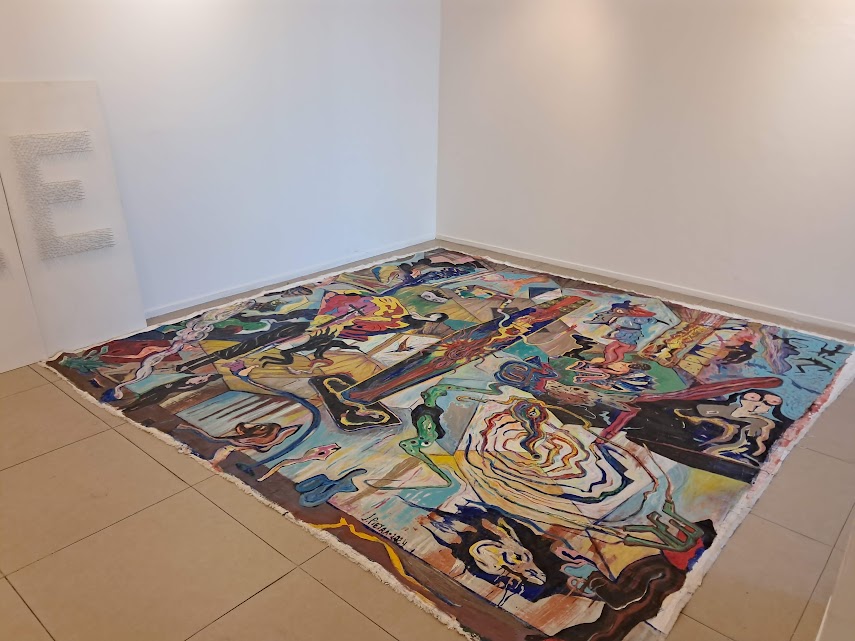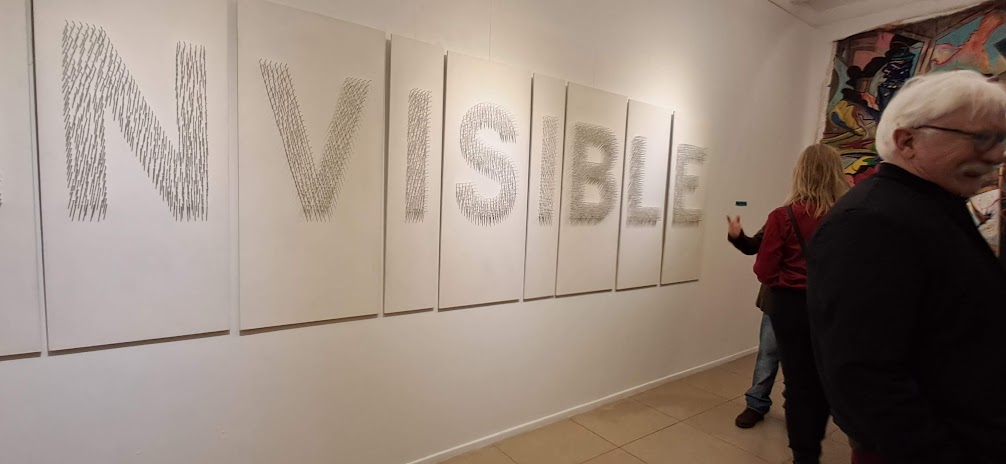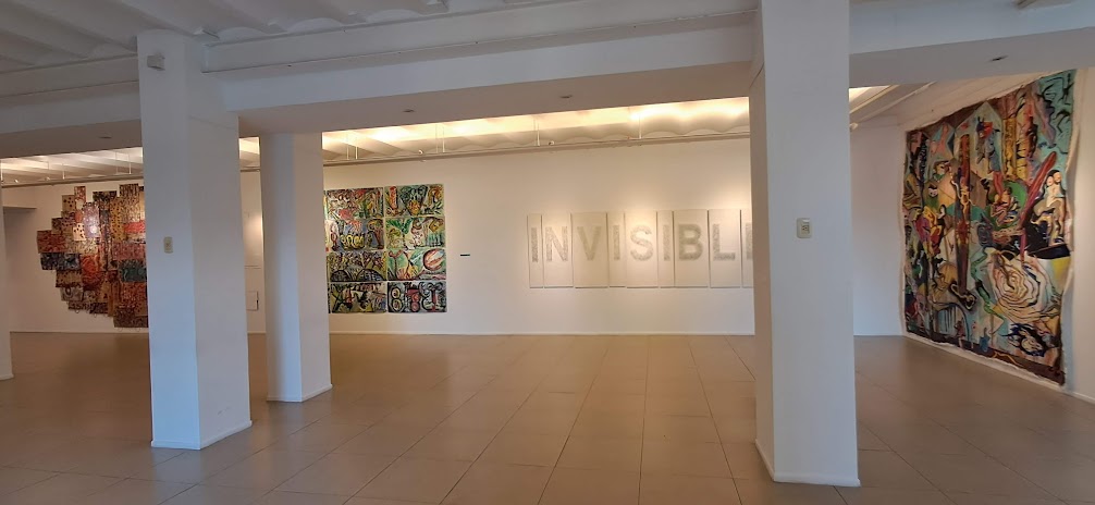 Siguiendo por el lateral, aparece el gran Collage de Lidia Makaroff (300 x 400 cm), realizado con bolsas de papel pintadas. Junto a él se encuentra Fracciones, la abstracción orgánica de Jorge Pirozzi, desplegada en doce papeles pintados con acrílico (240 x 360 cm). A continuación, Milagro Torreblanca aporta su nota conceptual con Invisible (120 x 400 cm), realizada con clavos sobre madera, donde explora las distintas formas de violencia, dichas y no dichas.