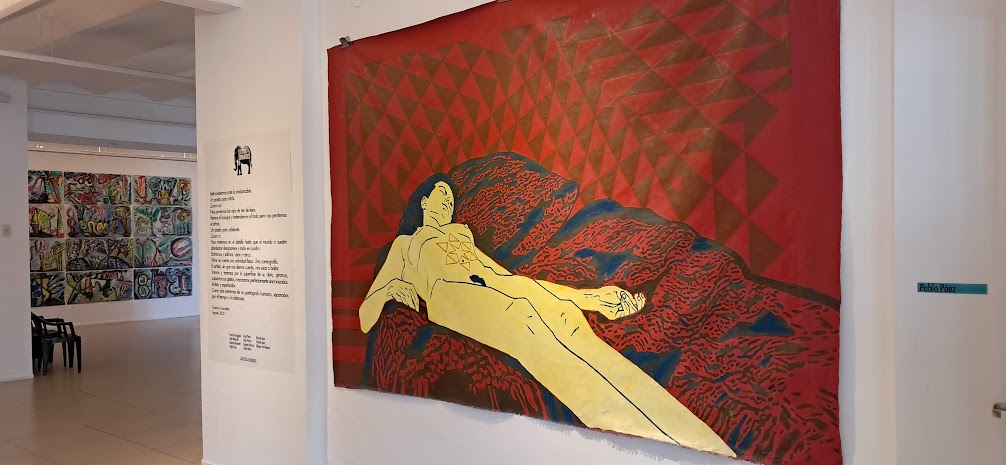 El recorrido comienza con las obras enfrentadas de Emilio Reato y Pablo Páez. Reato presenta Tormenta (100 x 550 cm), una sorprendente pintura acrílica donde se agolpan muñecos y bañistas en la playa, y Páez despliega Desnudo sobre fondo rojo (300 x 350 cm), un telón vibrante que reafirma la potencia del gran formato.