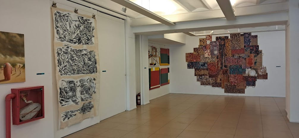 A continuación, detalla González, Francisco Baggiani exhibe Viento Norte, cuatro dibujos en carbonilla reunidos en una tela (300 x 160 cm). En la pared contigua, Andrea Martinetti presenta Esto no es aquello XL (200 x 300 cm), un políptico geométrico en ensamble de madera y collage.
