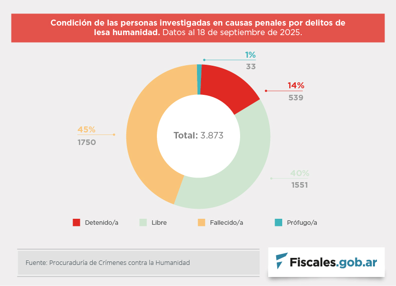 La estadística es el resultado de la actualización trimestral de las principales variables relacionadas al juzgamiento de los crímenes del terrorismo de Estado, a partir de la sistematización y el procesamiento de datos que realiza la procuraduría especializada de la información remitida por las fiscalías federales y unidades fiscales que intervienen en estos procesos en todo el país.