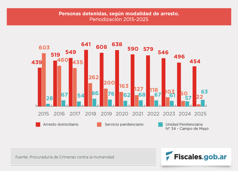 En los procesos por crímenes de lesa humanidad hay 539 personas privadas de su libertad. De estas últimas, 454 se encuentran en arresto domiciliario, 63 en la Unidad Penitenciaria N°34 de Campo de Mayo -que funciona dentro de la guarnición militar-, y 22 en cárceles de los servicios penitenciarios federal y provinciales.