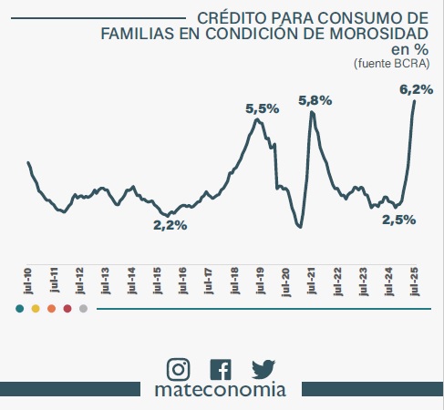 También que la morosidad de las familias que no pueden pagar la tarjeta llegara a valores récord. MATE plantea que, históricamente, el porcentaje de los saldos prestados por el sistema financiero a las familias que están en situación de irregularidad, varió entre 2% y 3%, “pero para julio llegó al 6,2%”.