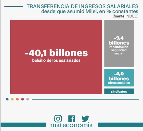 El cálculo fue realizado por el Mirador de la Actualidad del Trabajo y la Economía (MATE) en base a datos del INDEC, sumando la pérdida de recaudación de la seguridad social (-9,4 billones de pesos), la financiación de obras sociales (-4 billones de pesos), de los sindicatos (-1,5 billones de pesos) y la parte del león: los 40,1 billones de pesos que dejaron de percibir los trabajadores y trabajadoras en relación de dependencia.