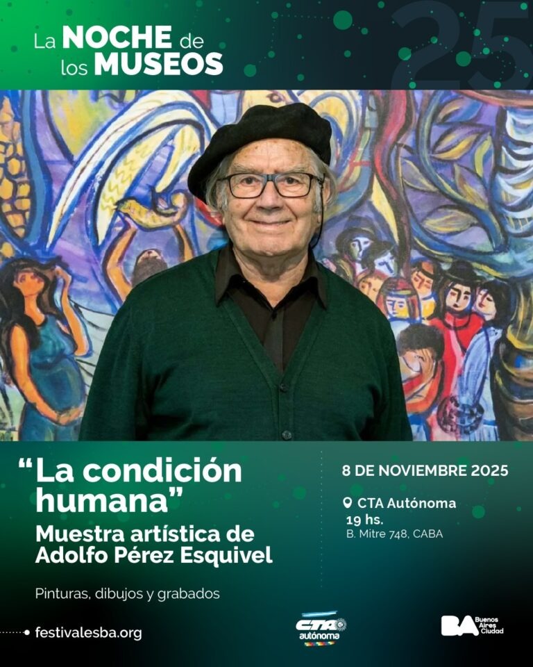 Por Manuel Rodríguez | En el marco de La Noche de los Museos y tras unas muestras realizadas el año pasado en el Museo Evita, en el Cabildo y en Morón luego de 50 años sin exponer, el Premio Nobel de la Paz Adolfo Pérez Esquivel presentará La condición humana, una muestra de pinturas, dibujos y grabados, sus obras como artista plástico. La convocatoria es en la sede de la CTA Autónoma Nacional (Bartolomé Mitre 748, CABA) este sábado a las 19.