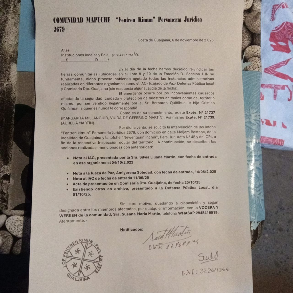 Al conocerse las detenciones, una Lof de Rawson difundió un comunicado público para explicar la trama detrás de la criminalización a los comuneros. Indicaron que, en este caso, las tierras en conflicto son los lotes 9 y 10 fracción D, sección J II de la colina mixta Gualjaina, ubicados sobre las costas del Río Lepa, que fueron “vendidos ilegalmente” por Bernardo Quiñihual e hijo, al exfutbolista de Newell’s All Boys y de otros clubes europeos, Aldo Duscher.