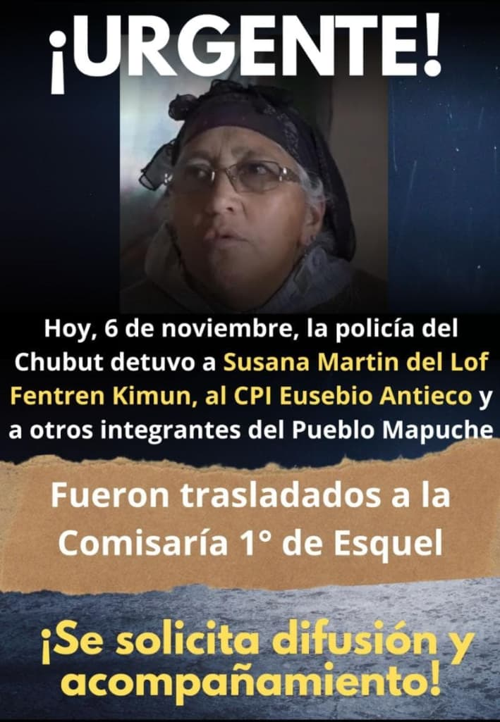 Redacción Canal Abierto | Ayer pasada la medianoche, Luis Virgilio, de La Gremial de Abogadas y Abogados confirmó la detención, en Chubut, de cuatro comuneros mapuche. Se trata de Eusebio Antieco, Paola Martínez, la werken (vocera) Susana Martin y Matías Cisterna, de la lof Newentuaiñ Inchin, de la costa del río Lepa, ubicada a unos 90 kilómetros de Esquel.