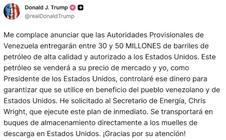 Por Elisa Corzo | Tras dejar en segundo plano la excusa del narcoterrorismo y decir con todas las letras que el objetivo detrás del bombardeo a Venezuela y el secuestro de Nicolás Maduro era el petróleo del país caribeño, en la tarde de ayer, Donald Trump dio más precisiones de cómo se concretaría la apropiación del recurso: anunció que la administración de Delcy Rodríguez le entregaría hasta 50 millones de barriles de petróleo a cambio de fondos que él mismo administraría.