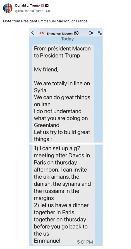 También en Truth Social, el mandamás en la Casa Blanca ha compartido un mensaje de texto que le envió Macron: “Amigo mío, estamos totalmente alineados sobre Siria. Podemos hacer grandes cosas en Irán. [Pero] no entiendo lo que haces en Groenlandia. Permití que construyamos grandes cosas juntos”.