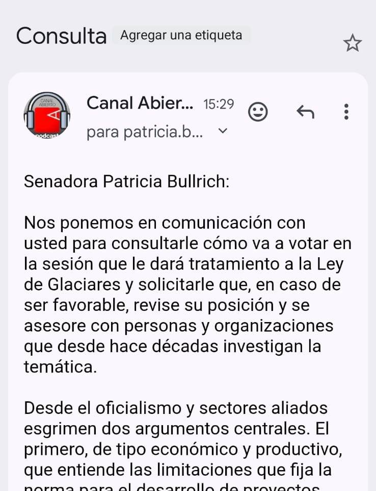 Ante esto, la propuesta es que cada persona le escriba a los tres senadores que representan a su provincia, para “con respeto pero con firmeza” pedirle que rechacen la modificación a la Ley de Glaciares.