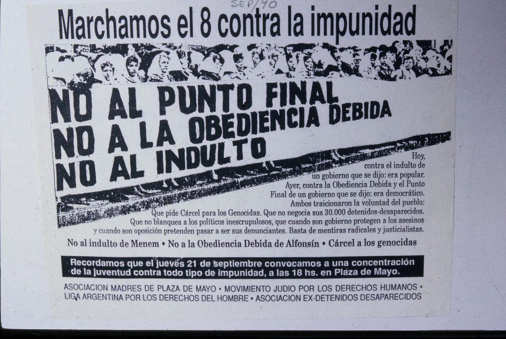 Se vuelve muy fuerte entre 1986 y el 90, en rechazo a las leyes de impunidad: Punto Final, Obediencia Debida y luego los indultos de Carlos Menem.