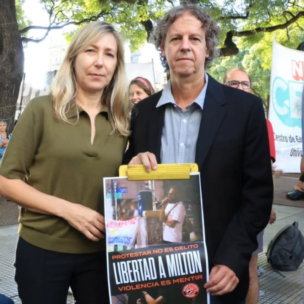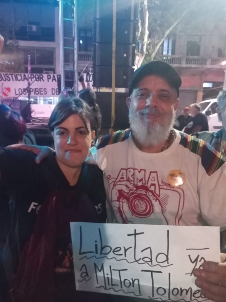 -Le pediría a todos los compañeros y compañeras, a todos los organismos, partidos políticos, asambleas barriales, asociaciones civiles, a los diputados, diputadas, senadores y senadores, que se sumen al apoyo y al pedido de liberación. Porque Milton luchó para que ninguno sea esclavo, para que no haya leyes que hagan retroceder nuestros derechos laborales. Milton luchó para que su propia hija y los hijos de todos nosotros no vivan en condiciones paupérrimas. Y por la libertad y por el derecho al tiempo libre, que hoy parece mala palabra pero que es fundamental para generar conciencia de clase, y eso trae organización.