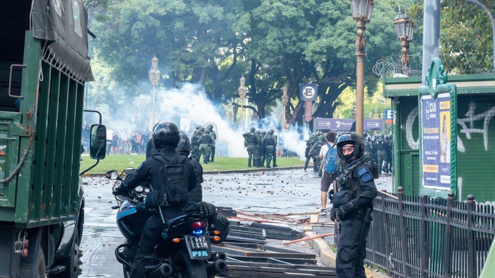 El protocolo de seguridad implementado apenas asumieron el gobierno está destinado a impedir movilizaciones, protestas y cortes. Cada miércoles las fuerzas de seguridad apalean jubilades en los alrededores del Congreso. El 12 de junio de 2024, día que se votó la Ley Bases, detuvieron más de cien personas a las que el gobierno acusó de sedición. Cada movilización termina en cacería, las personas detenidas son procesadas y el gobierno busca aplicarles la ley antiterrorista. Policías motorizados se lanzan a la caza de quienes desconcentran, como si recibieran un pago extra por cada ojo que se pierde con sus disparos. En Mendoza, se persigue y detiene ilegalmente cada vez que se manifiesta en defensa del agua de los glaciares. En marzo de 2025, el fotógrafo Pablo Grillo recibió un disparo con un tubo de gas lacrimógeno que lo dejó al borde de la muerte. Amenazan a trabajadores de prensa y fotorreporteres, porque no quieren testigos de lo que hacen.