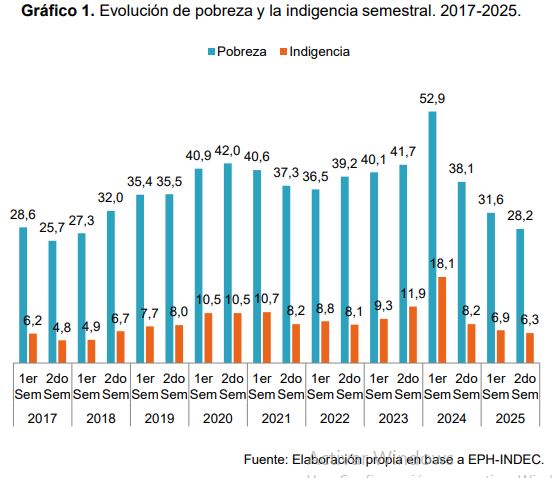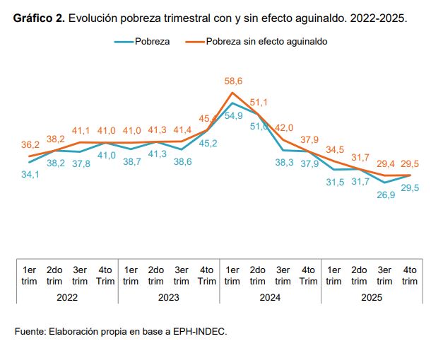 En este contexto, el estudio puntualiza que “si se estima la pobreza y la indigencia trimestral sin computar el aguinaldo (para evitar problemas de comparabilidad) los resultados oficiales indican que la baja de la pobreza ya se detuvo en el 3er trimestre 2025, mientras que la indigencia tiende a estancarse desde mediados del año pasado”.
