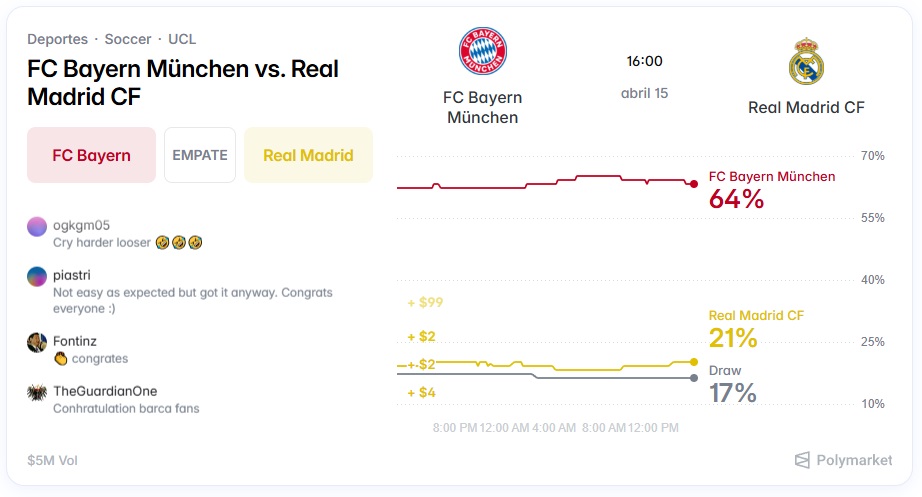 Polymarket se autodefine como “el mercado de predicción más grande del mundo”, que “te permite mantenerte informado y beneficiarte de tu conocimiento apostando en eventos”. Básicamente es una plataforma web en la que los usuarios -anónimos- pueden realizar apuestas sobre todo tipo de acontecimientos futuros: resultados deportivos, indicadores económicos, patrones climáticos, concursos y premios, resultados políticos y electorales. Quienes participan pueden comprar acciones “Sí” o “No” en la criptomoneda USD Coin a través de la red blockchain Polygon y negociar sus valores de acuerdo a la probabilidad de resultados futuros. Los guarismos cambian en tiempo real a medida que otros traders operan y las acciones pueden ser vendidas en cualquier momento de acuerdo al valor que tengan minuto a minuto.