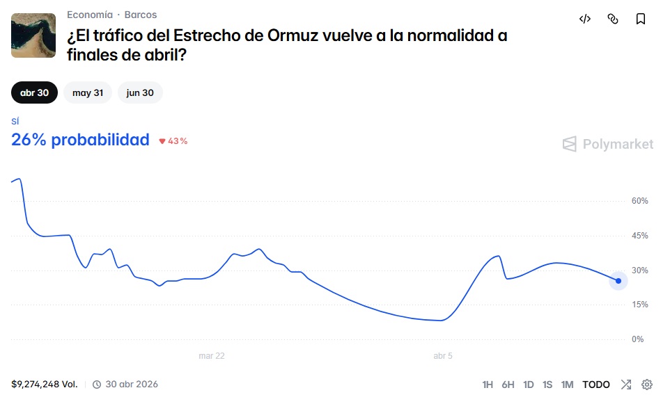 Una de las últimas predicciones en juego en estas horas es la siguiente: “¿El tráfico en el estrecho de Ormuz volverá a la normalidad a finales de abril?”.