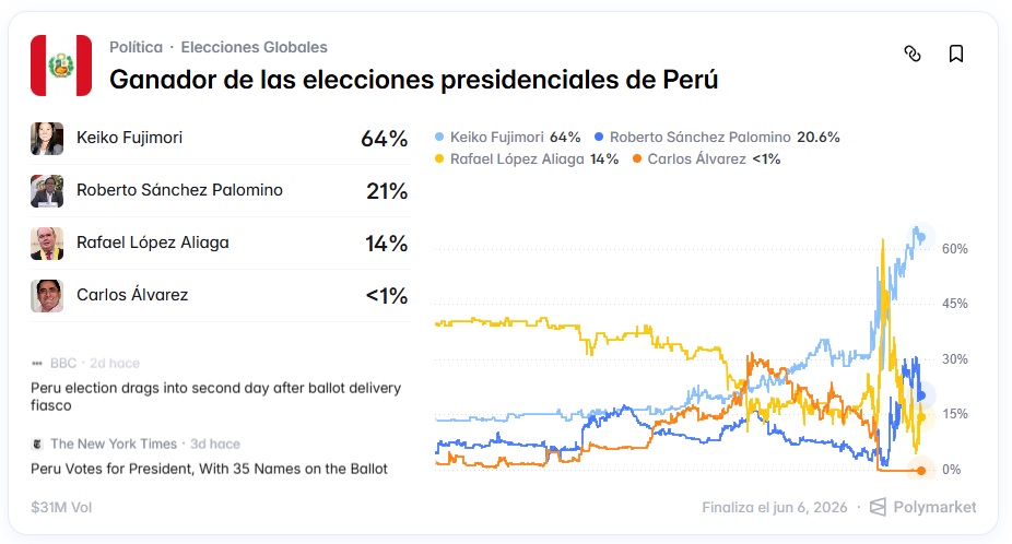 Hay otras plataformas que funcionan de manera similar como Kalshi o Predict It. En las últimas horas las principales pujas eran las electorales, por los resultados en la primera vuelta presidencial en Perú o las parlamentarias de Hungría que terminaron con el gobierno de Orban.