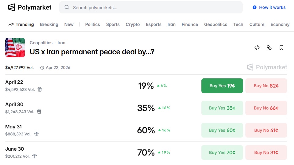 Veamos un ejemplo. En este momento -lunes 13 de abril- la principal apuesta en la web de Polymarket es: “¿En qué fecha Estados Unidos e Irán firmarán un acuerdo de paz permanente?”