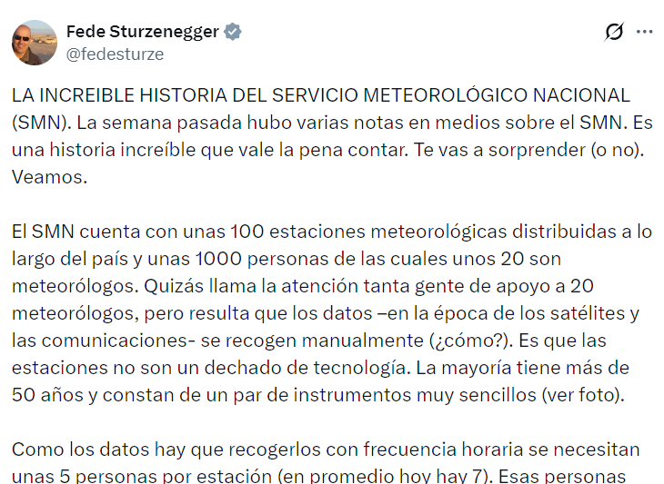 Redacción Canal Abierto | Este fin de semana el ministro de Desregulación de Javier Milei, Federico Sturzenegger, publicó un tuit para intentar justificar el desguace y la privatización de funciones del Servicio Meteorológico Nacional (SMN). Entre otras falacias, afirmó que el organismo solo cuenta con 20 meteorólogos y cuestionó el atraso tecnológico de los sistemas de recopilación de datos, algo que –además- su Gobierno se encargó de perpetuar.